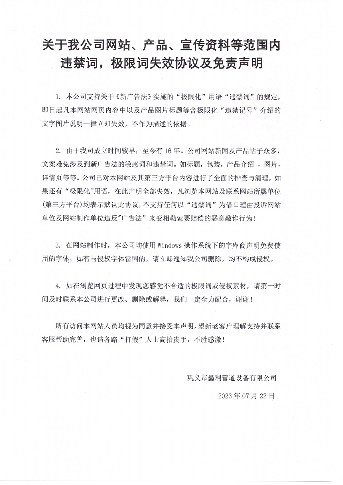 關(guān)于我公司網(wǎng)站、產(chǎn)品、宣傳資料等范圍內(nèi)違禁詞,極限詞失效協(xié)議及免責(zé)聲明